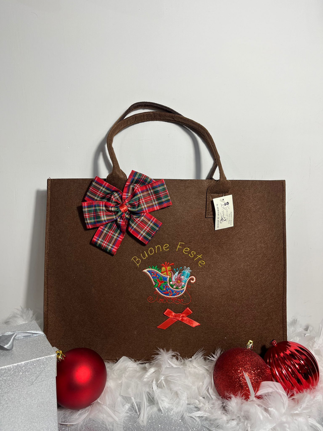 Scoprite il nostro assortimento di borse natalizie uniche e ricamate, perfette come regali speciali o eleganti porta regalo per le festività. Ogni borsa è un'autentica opera d'arte in feltro, arricchita da ricami esclusivi che catturano l'essenza del Natale in ogni dettaglio.