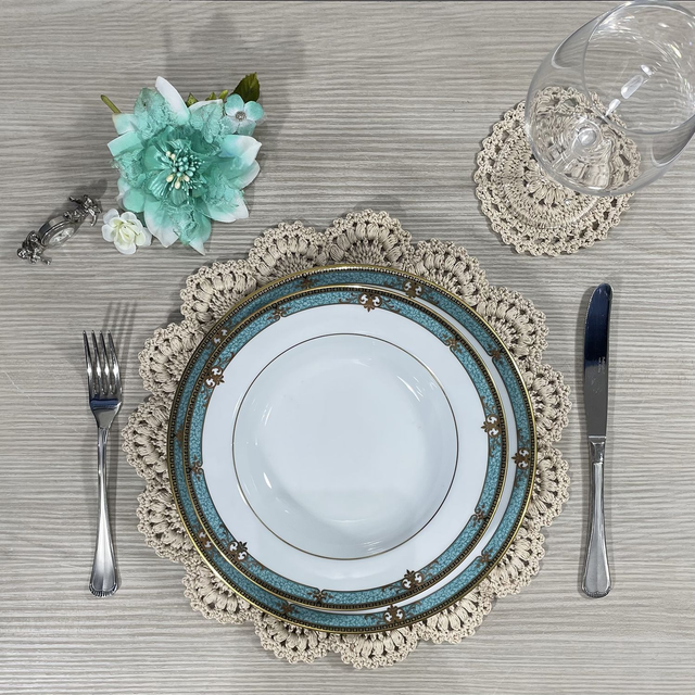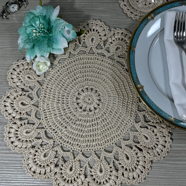 "Aggiungi un tocco di eleganza artigianale alla tua tavola con il nostro esclusivo set sottopiatto e sottobicchiere all'uncinetto fatto a mano.I dettagli dell'uncinetto si fondono armoniosamente con qualsiasi arredamento, creando un'atmosfera accogliente e raffinata per ogni pasto. Il sottopiatto, con la sua trama delicata e la dimensione perfetta, aggiunge un tocco di lusso sotto ogni piatto, proteggendo al contempo il tuo tavolo dalle antiestetiche macchie e graffi.